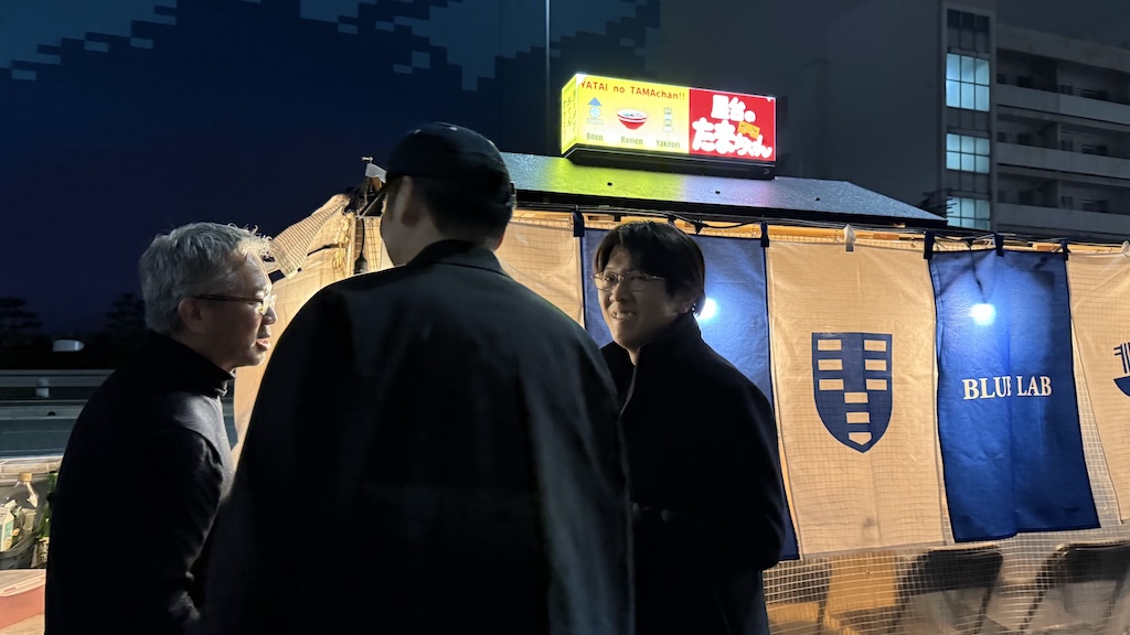 長浜屋台街にある「たまちゃん」という小さなラーメン屋台。そこで開かれたミートアップでの出来事です。主催したのは先日に取材したみずほの中馬和彦さん。みずほフィナンシャルグループ・みずほ銀行で執行役員 CBDO を務め、Blue Lab 代表取締役として新しい産業創出の取り組みをスタートさせています。